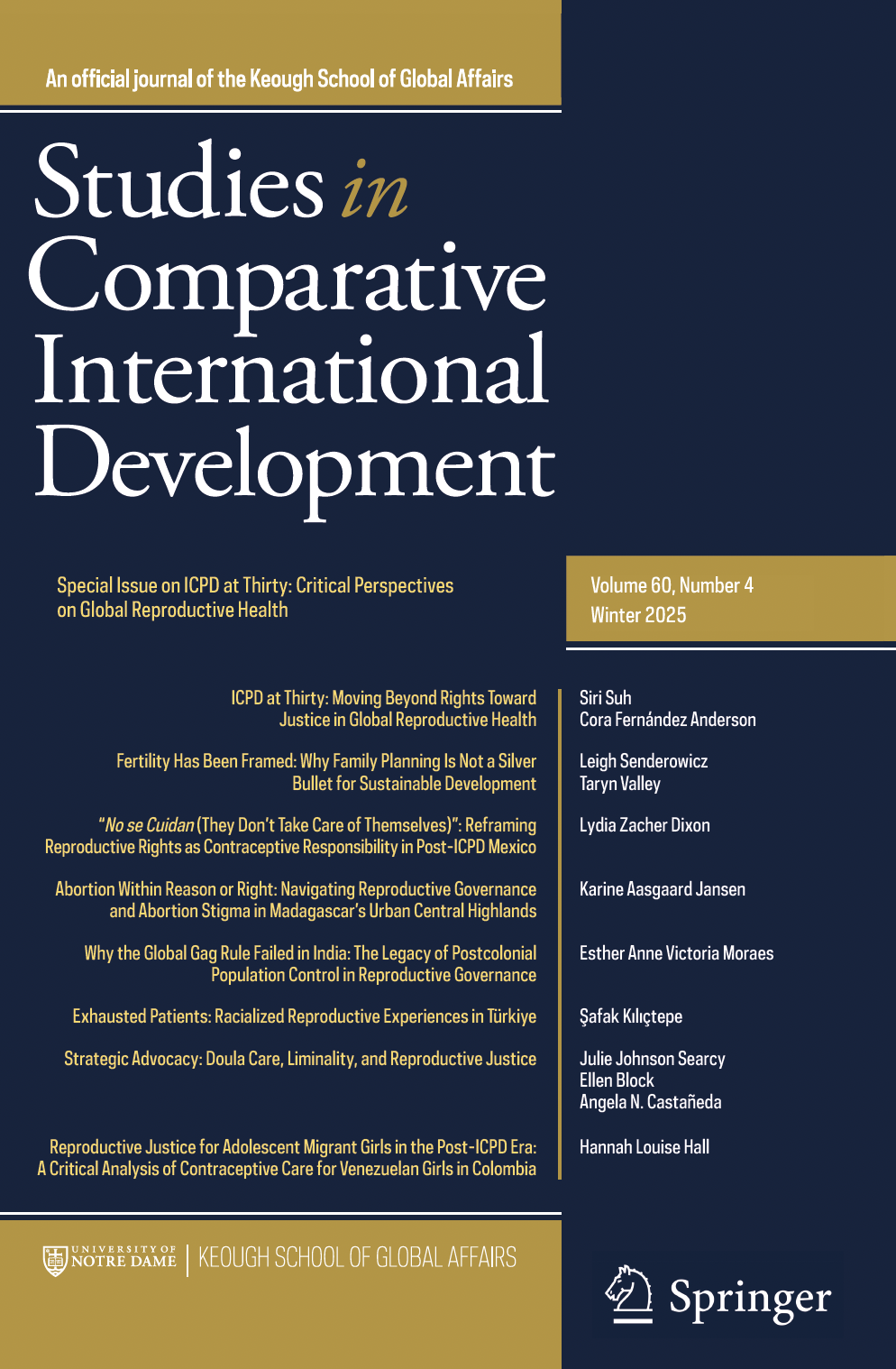We are thrilled to announce that our Special Issue titled "ICPD at Thirty: Critical Perspectives on Global Reproductive Health" has just been published in Studies in Comparative International Development. Take a look and please share far and wide—five articles are open access, including the brilliant introduction by guest editors Professor Siri Suh and Professor Cora Fernandez Anderson. The concept of reproductive justice was conceptualized and has been pushed for decades by women of color in the US and around the world, and this special issue reflects how critical their ceaseless efforts have been for all people.